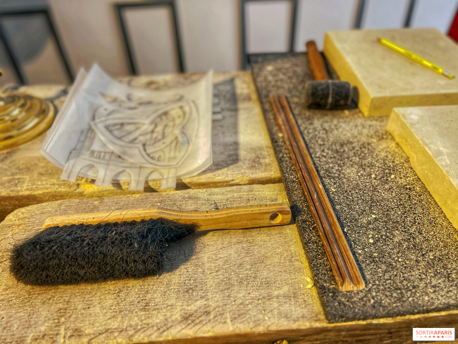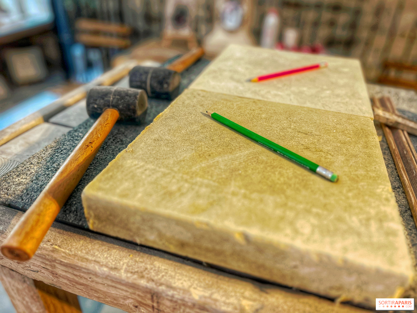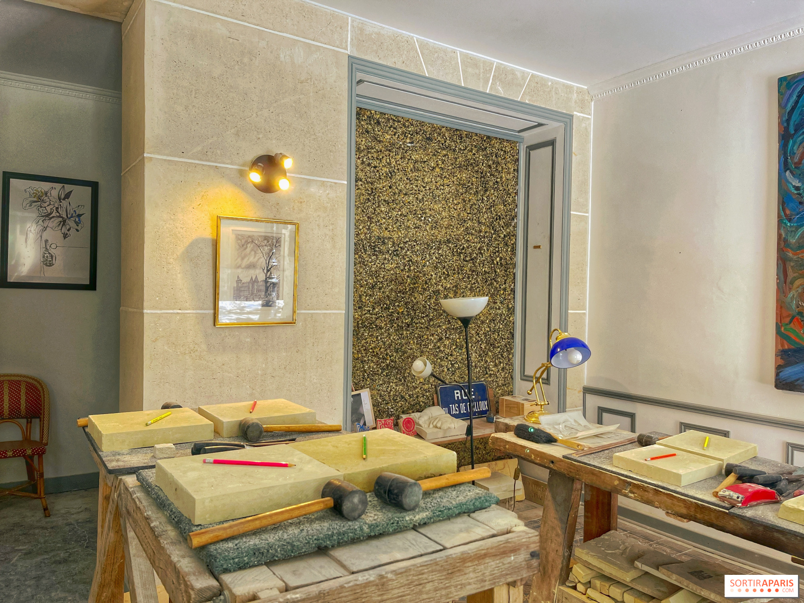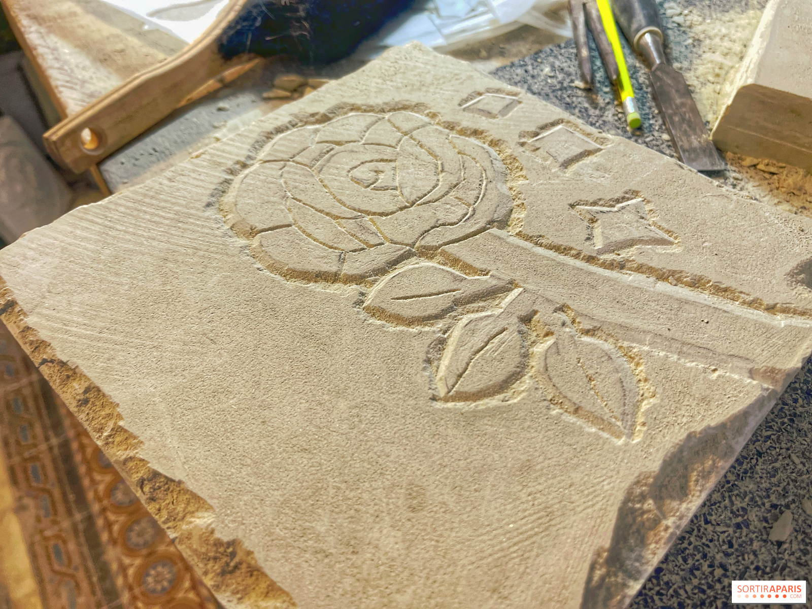 När du anländer till denna vackra historiska verkstad i Marais-distriktet i Paris sätter doften av sten snabbt stämningen. Du sätter dig vid ditt bord, framför din 25×25 cm stora sten och dina verktyg, tillsammans med de andra lärlingarna för dagen, och börjar arbeta med den design du vill skapa.