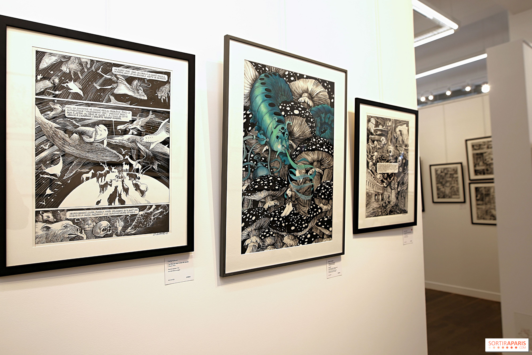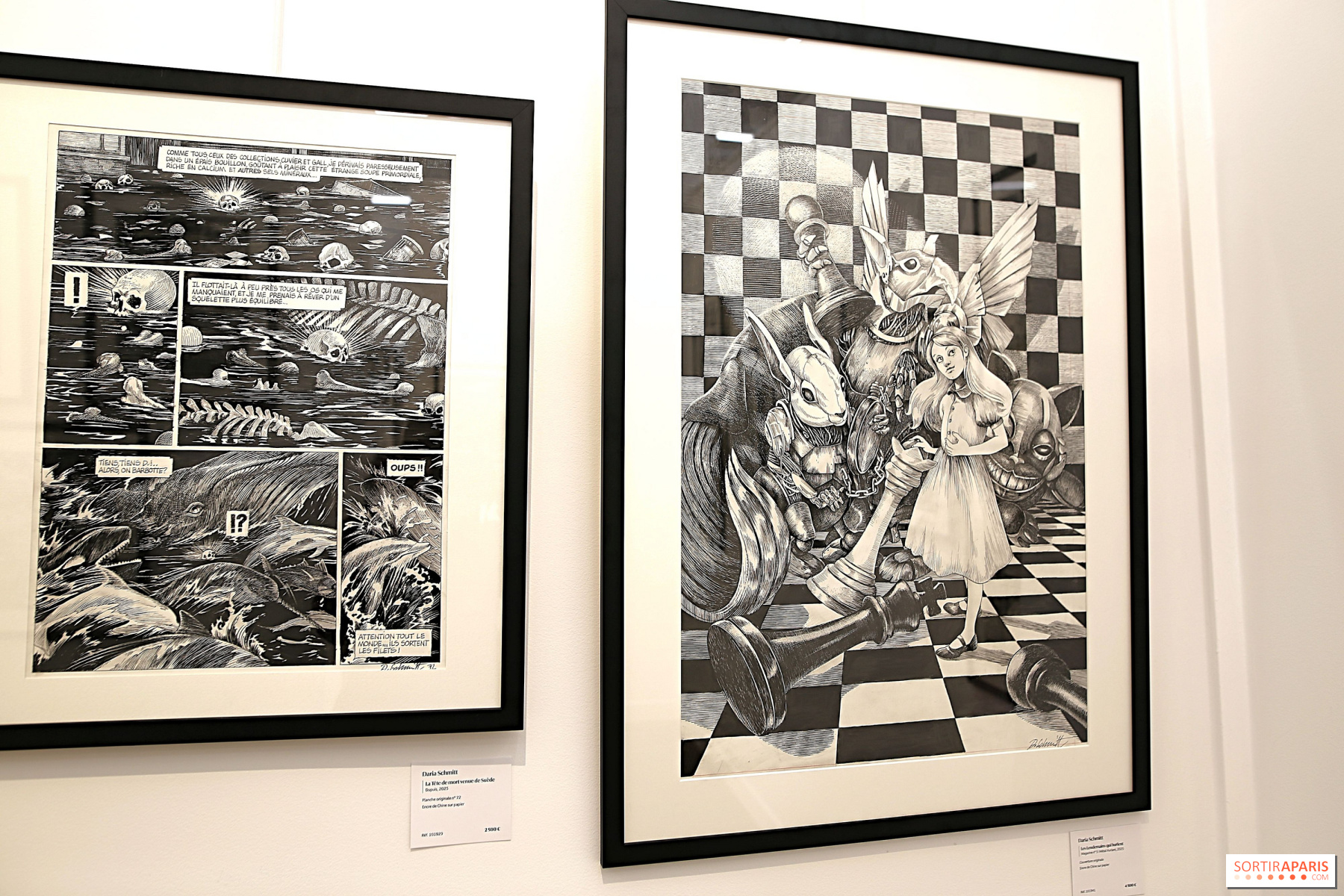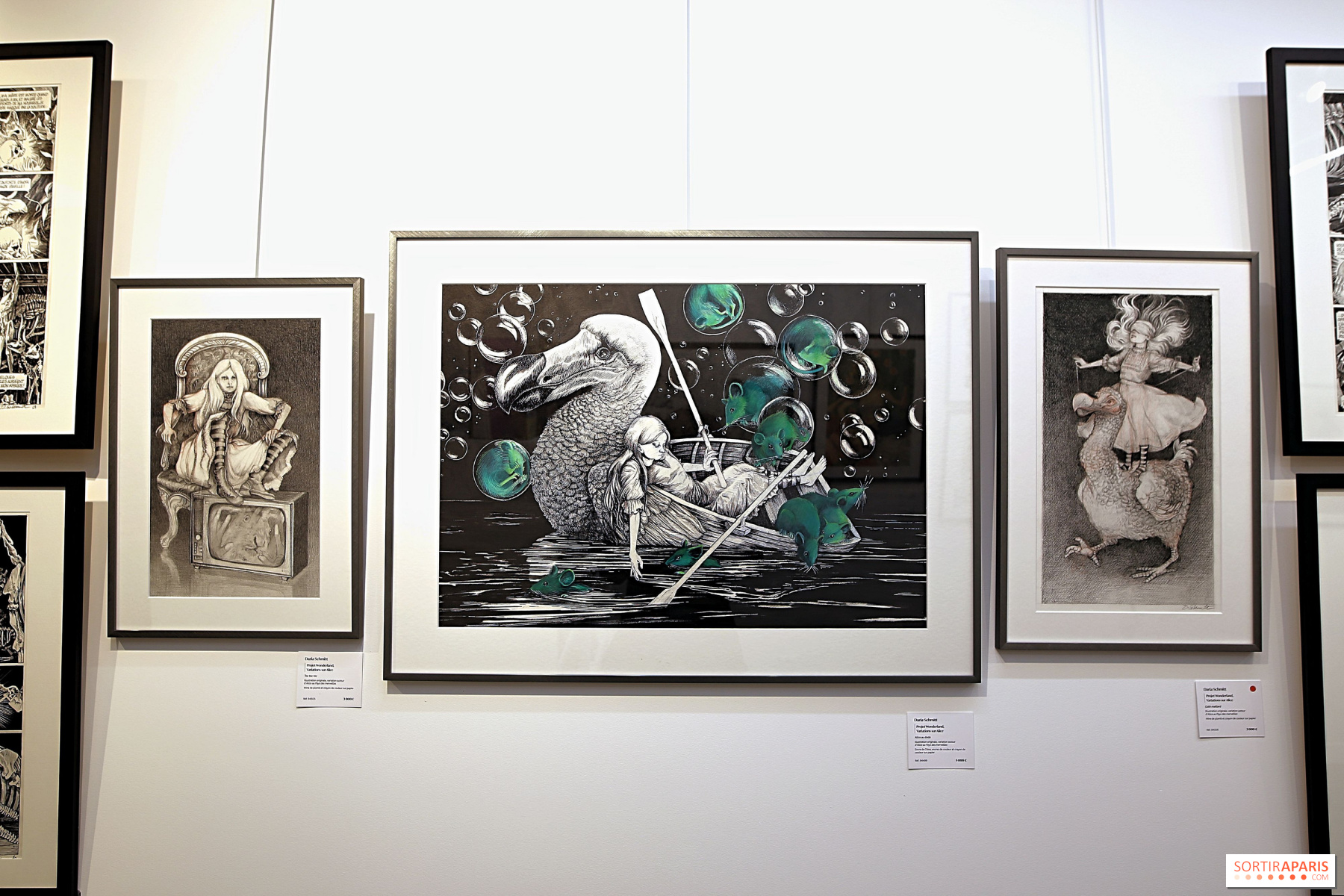 Även här hoppas Parisgalleriet kunna glädja konstnärens beundrare genom att presentera ett femtiotal originalplanscher från albumet, liksom sublima illustrationer av Alice i Underlandet, planscher från"Bestiaire du Crépuscule" och"Ornithomaniacs", för att inte glömma ett otroligt verk utfört i tusch och bladguld. För fans av Daria Schmitts verk anordnar Daniel Maghen Gallery en exklusiv signeringsstund med henne lördagen den 20 september kl. 13.30-15.30. Observera att endast 10 biljetter - som distribueras samma morgon som galleriet öppnar - ger tillgång till denna signeringsstund.