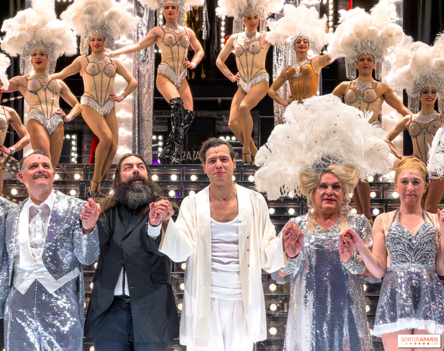 I centrum för denna stora fest står Laurent Lafitte, som är nästan oigenkännlig i rollen som Zaza alias Albin, en exuberant diva och en oemotståndligt charmig huvudperson. Skådespelare, dansare och numera även sångare – ja, han sjunger, och det passar honom som handen i handsken! – han utstrålar en ömhet och energi som gör honom till scenens verkliga drottning. Men Zaza och hennes ikoniska kläder överskuggar inte ensemblen: groteska, stela eller rörande, var och en av karaktärerna lyser på sitt sätt, medandussinet dansare, verkliga drottningar, förvandlar varje nummer till en hyllning till skönhet och excentricitet.