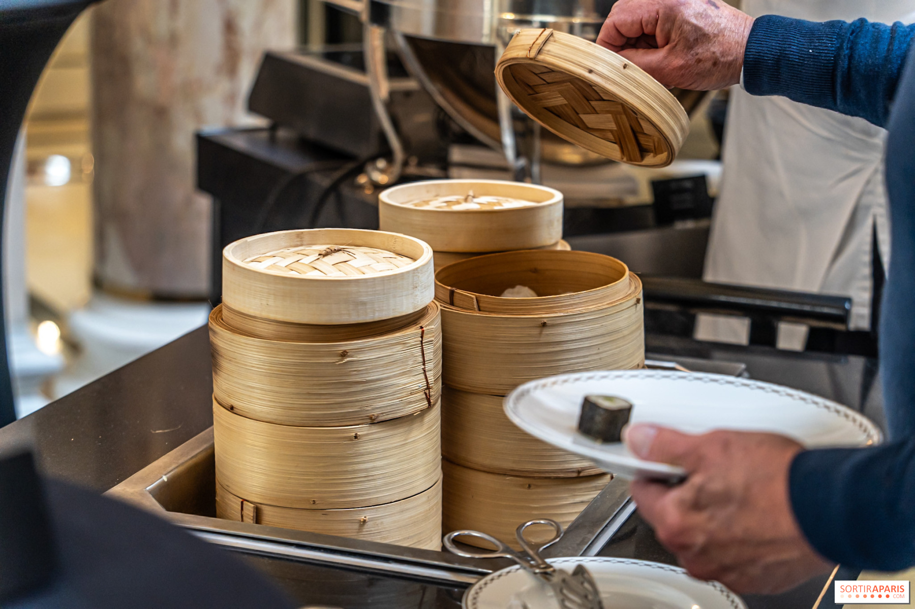 När vi väl sitter bekvämt vid vårt bord ger vi oss iväg för att upptäcka brunchrummet, som ligger i en rotunda med många stationer runt om i rummet och i mitten. Vi börjar med en farandole av fina charkuterier, de berömda skaldjuren och ostronen i massor, blandade sallader och mångfärgade carpaccios, för att inte glömma sushi och ångad dim sum som ger buffén en asiatisk touch.