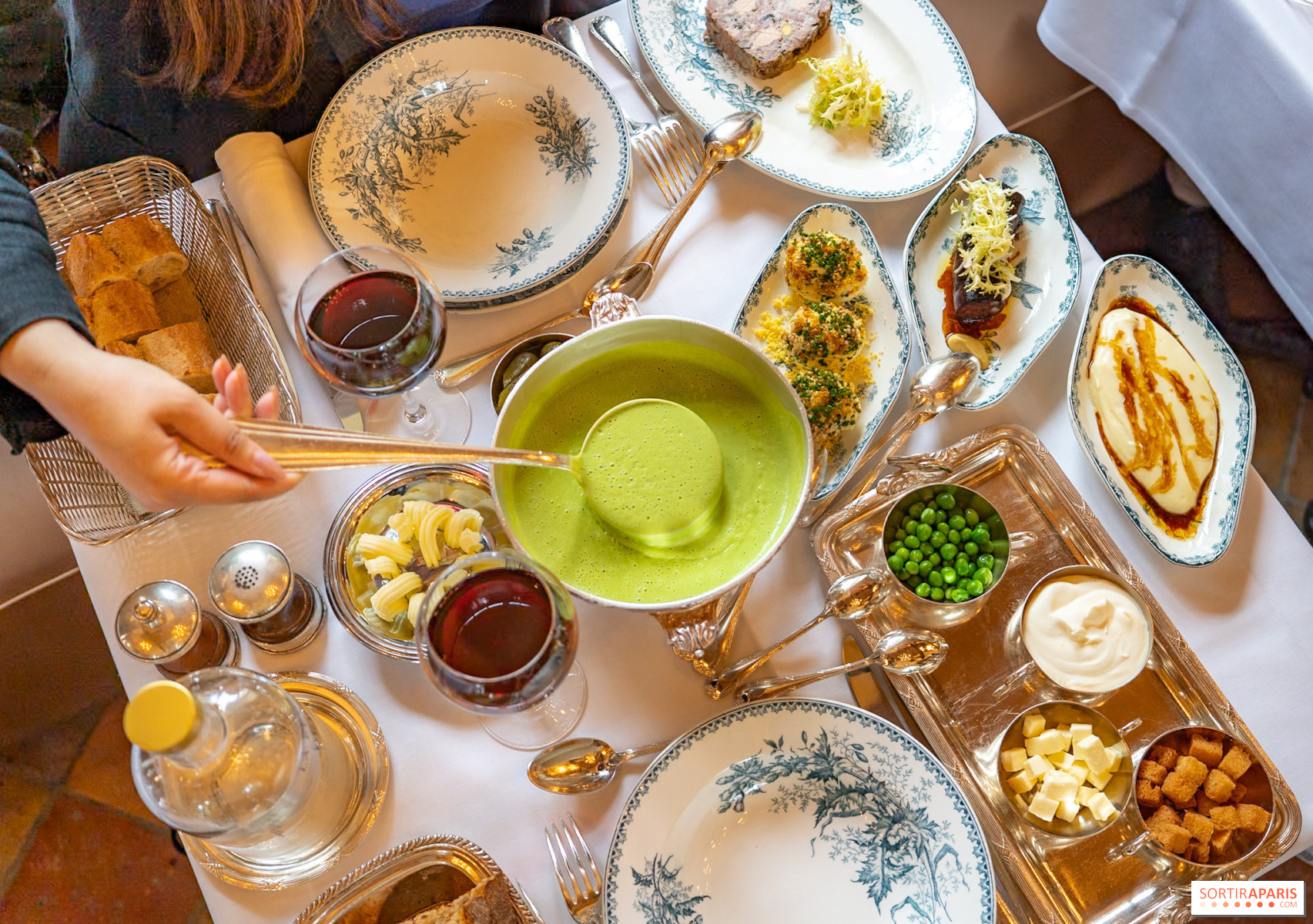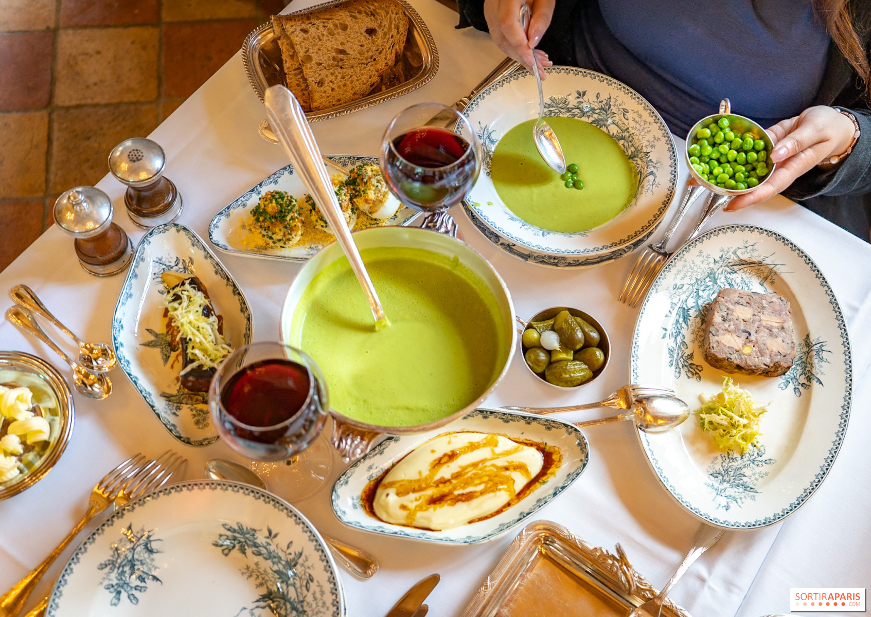 Slutligen är ärtsoppan, som serveras varm, förförisk med sin krämiga konsistens och generositet. Den åtföljs av en serveringstallrik så att vi kan lägga till krutonger, smör och ärtor som vi vill. En mild, växtbaserad upplevelse som är en trevlig omväxling från de andra rätterna som erbjuds, men inte mindre utsökt för det.