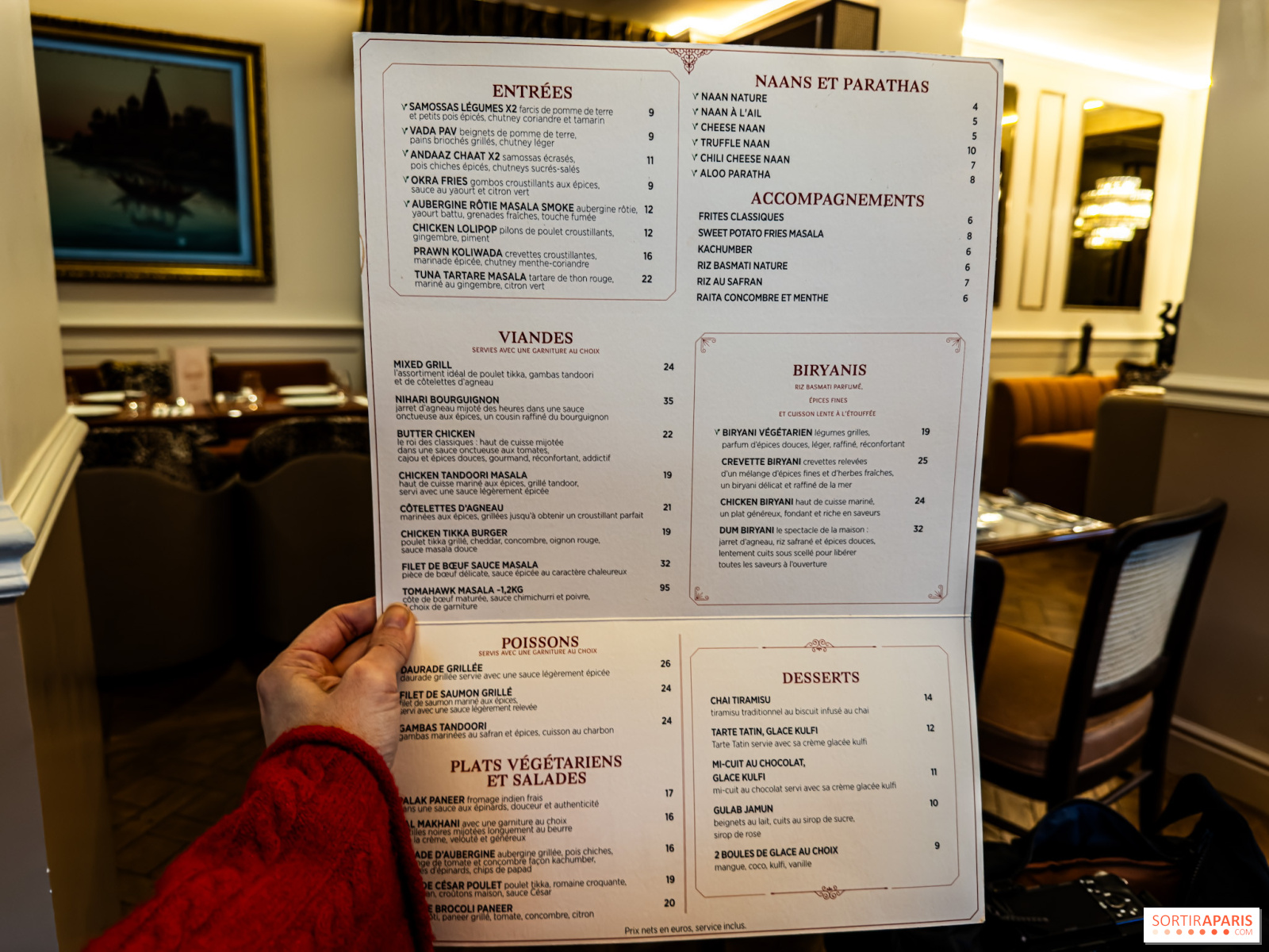ด้านอาหาร จัดว่าไม่มีทางพลาดเมนู butter chicken ซึ่งเป็นซิกเนเจอร์ของร้านและถือเป็นหนึ่งในเมนูคลาสสิคที่ได้รับความนิยมมากที่สุด เพราะเป็นไก่ตุ๋นในซอสครีมสดรสกลมกล่อม ผสมด้วยมะเขือเทศ เม็ดมะม่วงหิมพานต์ และเครื่องเทศนุ่มนวล ยิ่งกินก็ยิ่งฟิน อิ่มใจ ซอสเข้ากับข้าวหอมมะลิที่สั่งมาคู่กันอย่างลงตัว ข้าวหอมกลิ่นอ่อนๆ เพิ่มความหรูหราให้กับมื้ออาหาร สำหรับราคา 22 ยูโร ถือเป็นจานเด็ดที่ทำออกมาได้ดีและสมกับชื่อเสียงที่ได้รับจริง ๆ