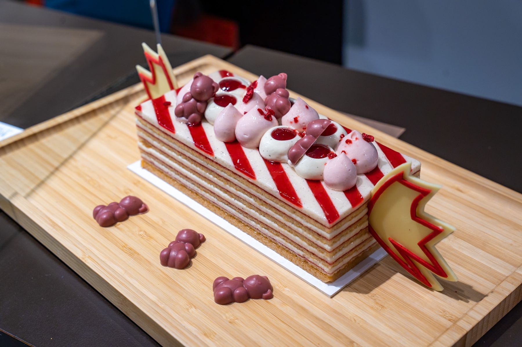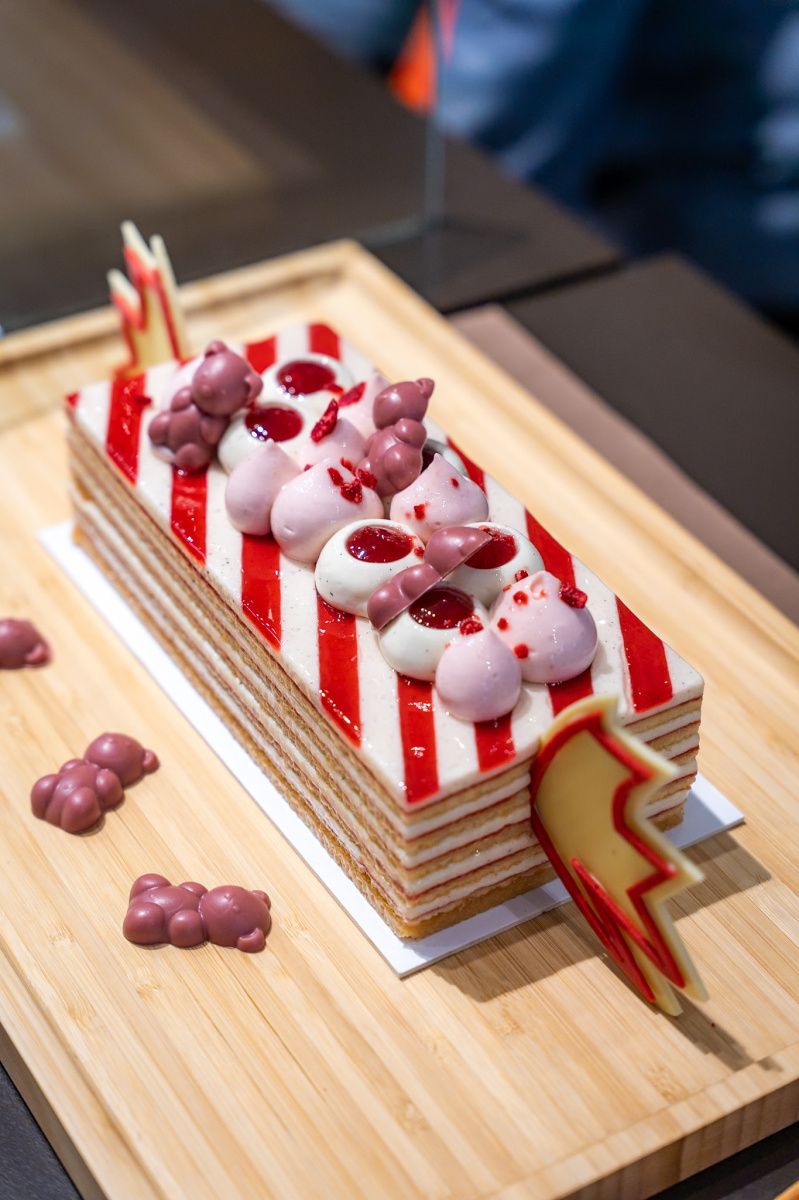 Meyveli tatlıları tercih edenler için Bonbon bûche güzel bir alternatif. Gerçek bir şekerlemeyi andıran bu nostaljik yaratımı keşfetmeye gidelim. Breton kurabiye tabanının üzerine, bademli bisküvi, çilek ve ahududu kompostosu ve vanilyalı mus katmanları dizilmiştir. Tazelik ve saf lezzetleri ön plana çıkaran, yeniden yorumlanmış bir millefeuille. Ve yanılmayın, bu tatlı sadece çocuklar için değil.