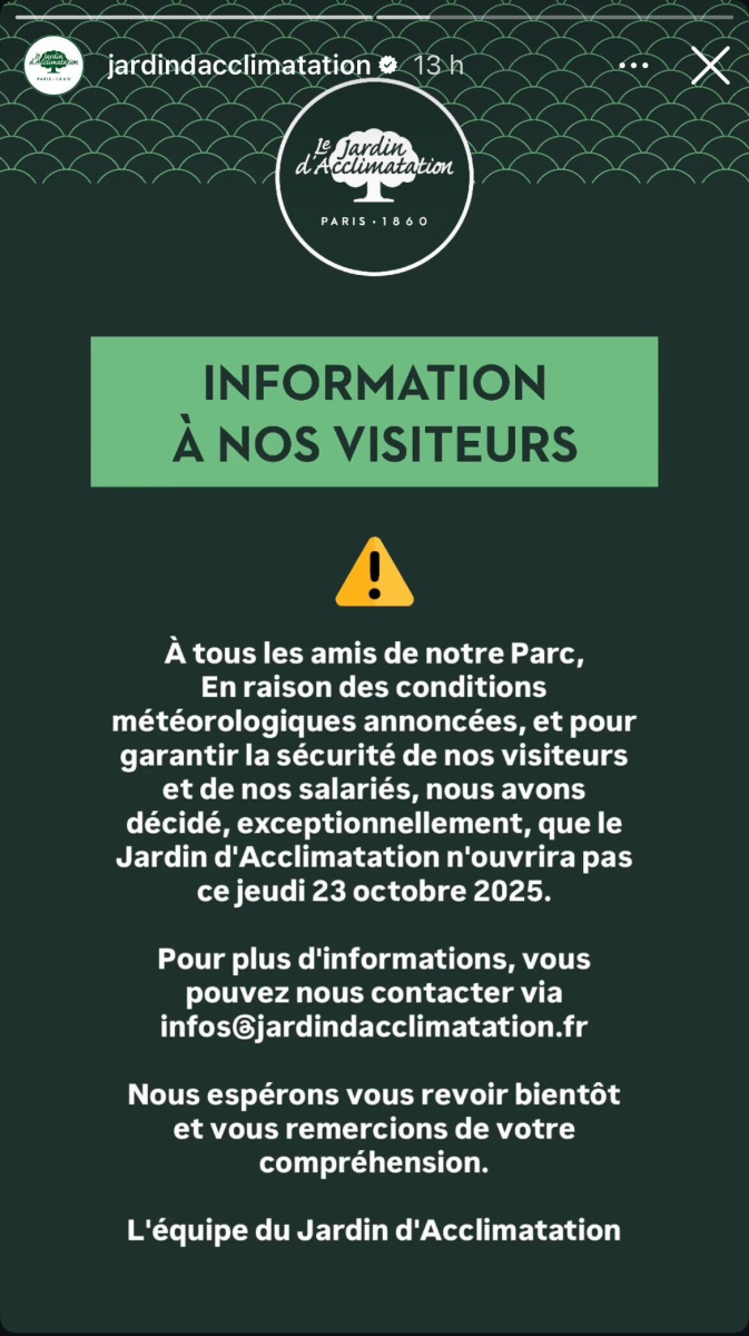 Bu koşullar karşısında, ziyaretçilerin ve çalışanların güvenliğini sağlamak amacıyla Jardin d'Acclimatation, sosyal medya hesapları ve internet sitesinde olağanüstü bir kapanış duyurusu yaptı. 23 Ekim Perşembe günü, 16. bölgedeki bahçe kapalı kalacaktır.