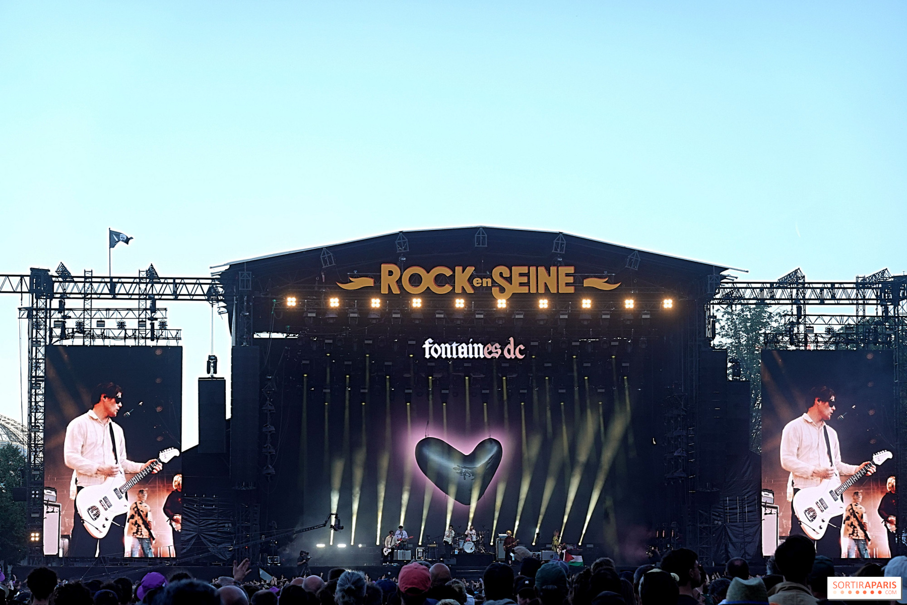 Sonunda hedefimize vardık, ancak ana sahneden çok uzakta, Fontaines D.C.'nin'Romance' başlıklı son albümünün kapağına bir gönderme olarak havada asılı duran devasa, deforme olmuş, gümüş renkli bir kalp keşfettik. İrlandalı topluluğun Domaine national de Saint-Cloud'da yankılanan aşındırıcı rock'ıyla daha ileri gitmek zor. Seyirciler arasında grubun logosunu taşıyan tişörtler giyen çok sayıda hayran vardı. Birçoğu da "I Love You ", "Bug ", "Favourite " ve İrlandalı grubun Saint-Cloud'daki setini kapatmak için seçtiği hit şarkısı "Starburster "ın nakaratlarına eşlik etti.