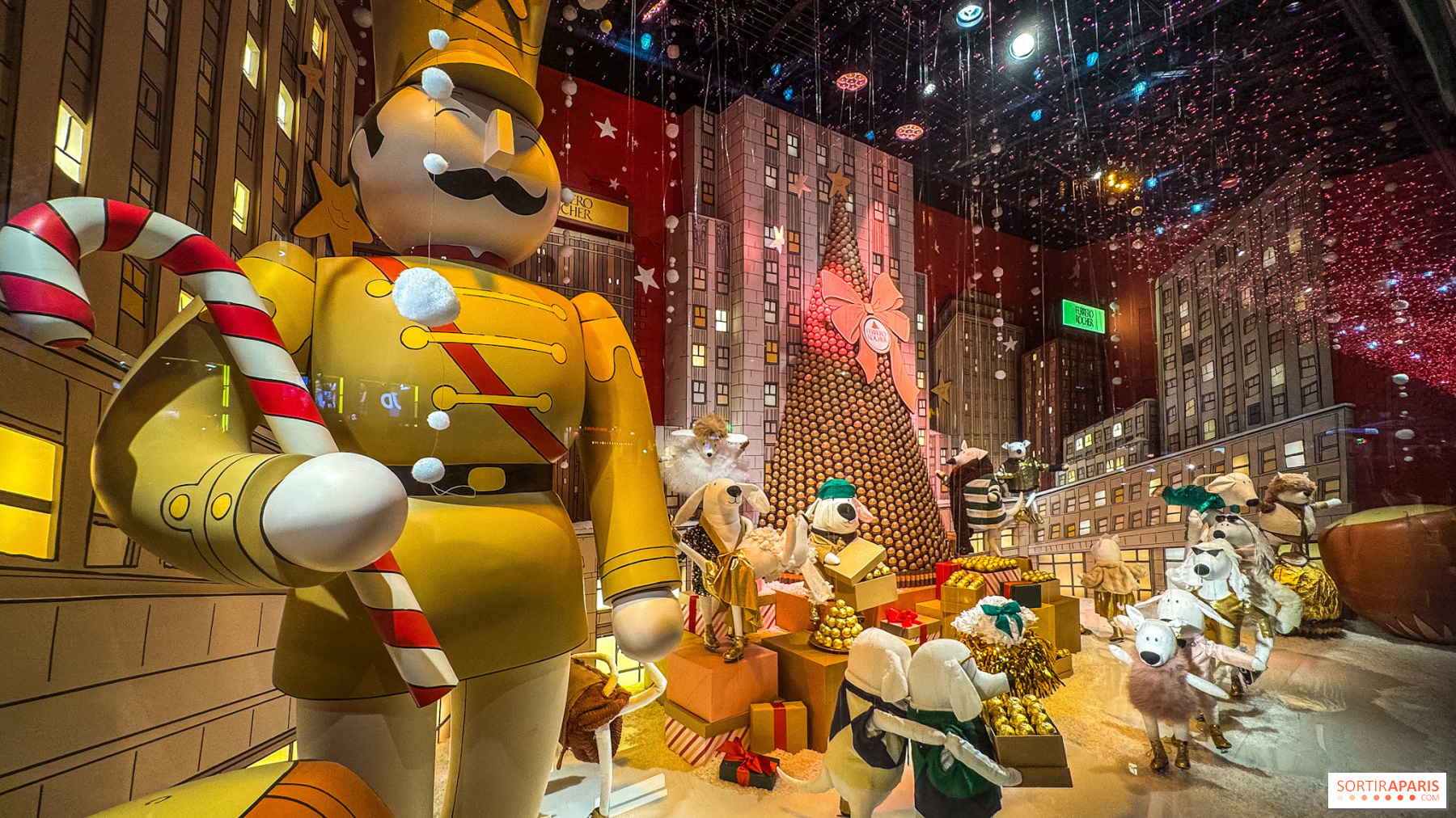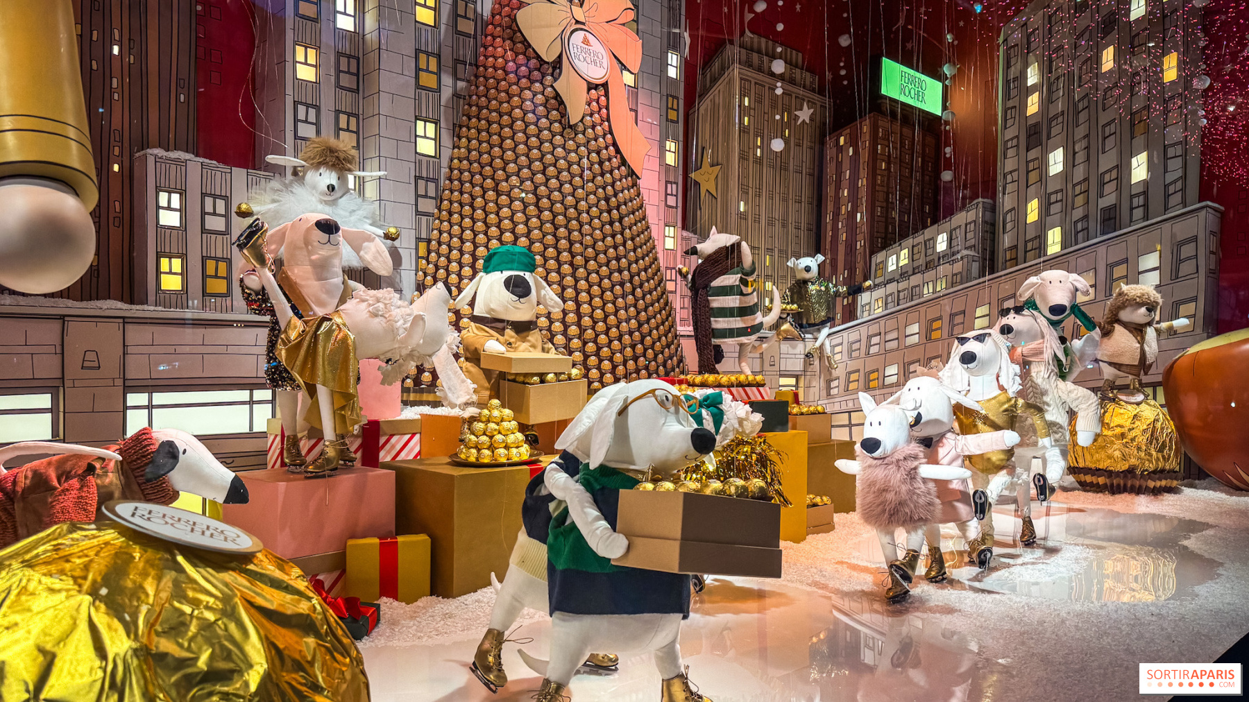 Під мерехтливим зоряним небом ковзанка оживає навколо золотої піраміди Ferrero Rocher, яка освітлює всю сцену, додаючи трохи магії та смаку. Собаки в пачках граціозно кружляють на льоду, інші ковзають на повній швидкості, а деякі обмінюються подарунками, наповненими знаменитими шоколадними цукерками. Серед сміху, елегантних піруетів і золотих ласощів дух новорічних свят оживає в казковій атмосфері Нью-Йорка. Ця вітрина передає зимову магію ковзанки Рокфеллер-центру, культового місця, де нью-йоркці люблять святкувати Різдво. Варто зазначити, що ресторани Printemps Haussmann пропонують ексклюзивні кондитерські вироби, створені спільно з Ferrero Rocher, щоб продовжити це смачне враження.