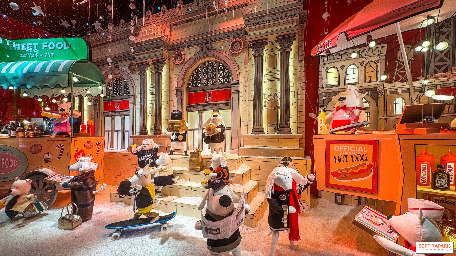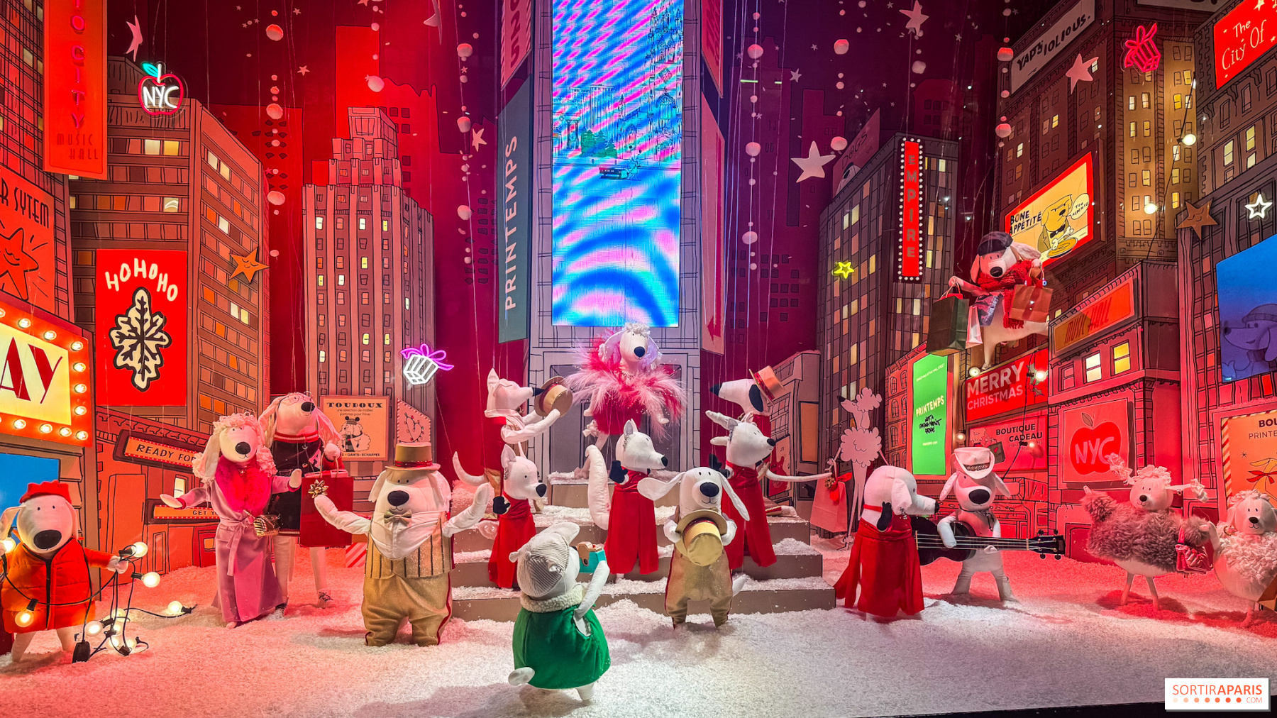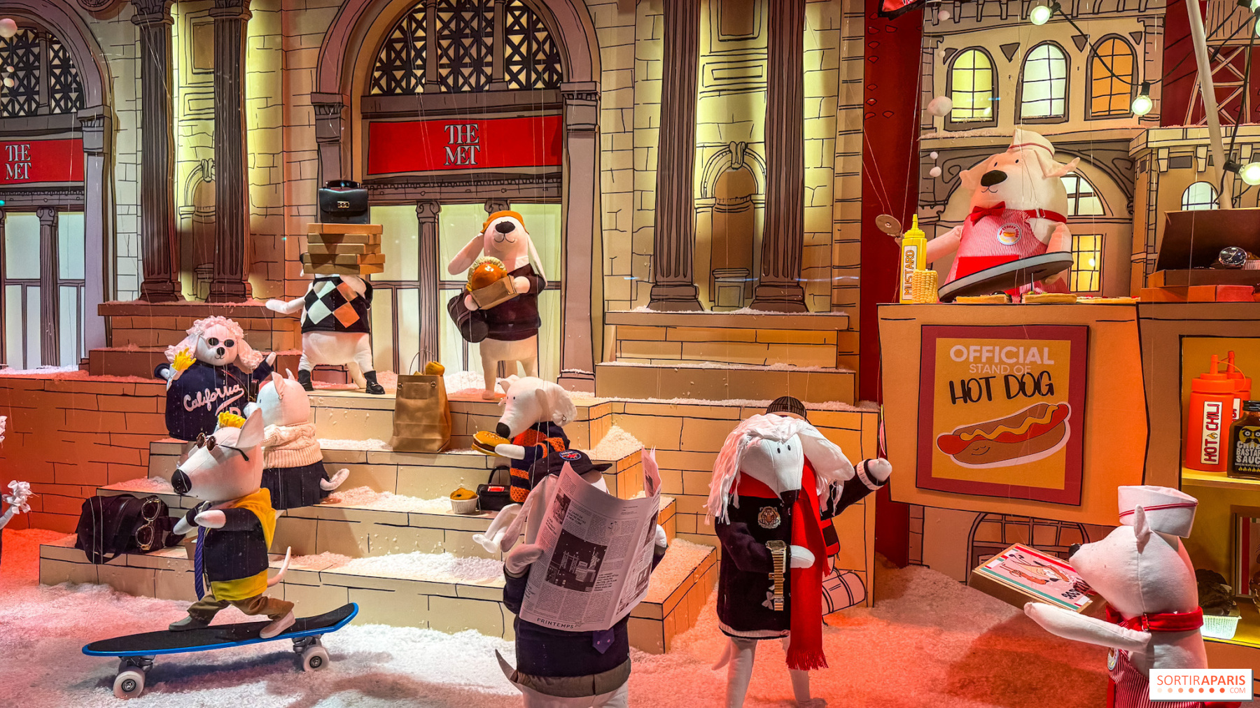 Катання на ковзанах, в'язаний різдвяний светр, міні-сумка для покупок, великий шарф або міні-хот-дог у руці — кожен аксесуар нагадує про сцену з життя Нью-Йорка. Поєднуючи в собі малюнок та емоції, ці виразні собаки розповідають історію дружби, досліджень та святкування. Вони уособлюють місто на рівні морди, повне сюрпризів і магії, між місцевими традиціями та відсиланням до майстерності Printemps. З метою забезпечення стійкості, персонажі, як і декорації, виготовлені з натуральних та переробних матеріалів, таких як картон і тканина.