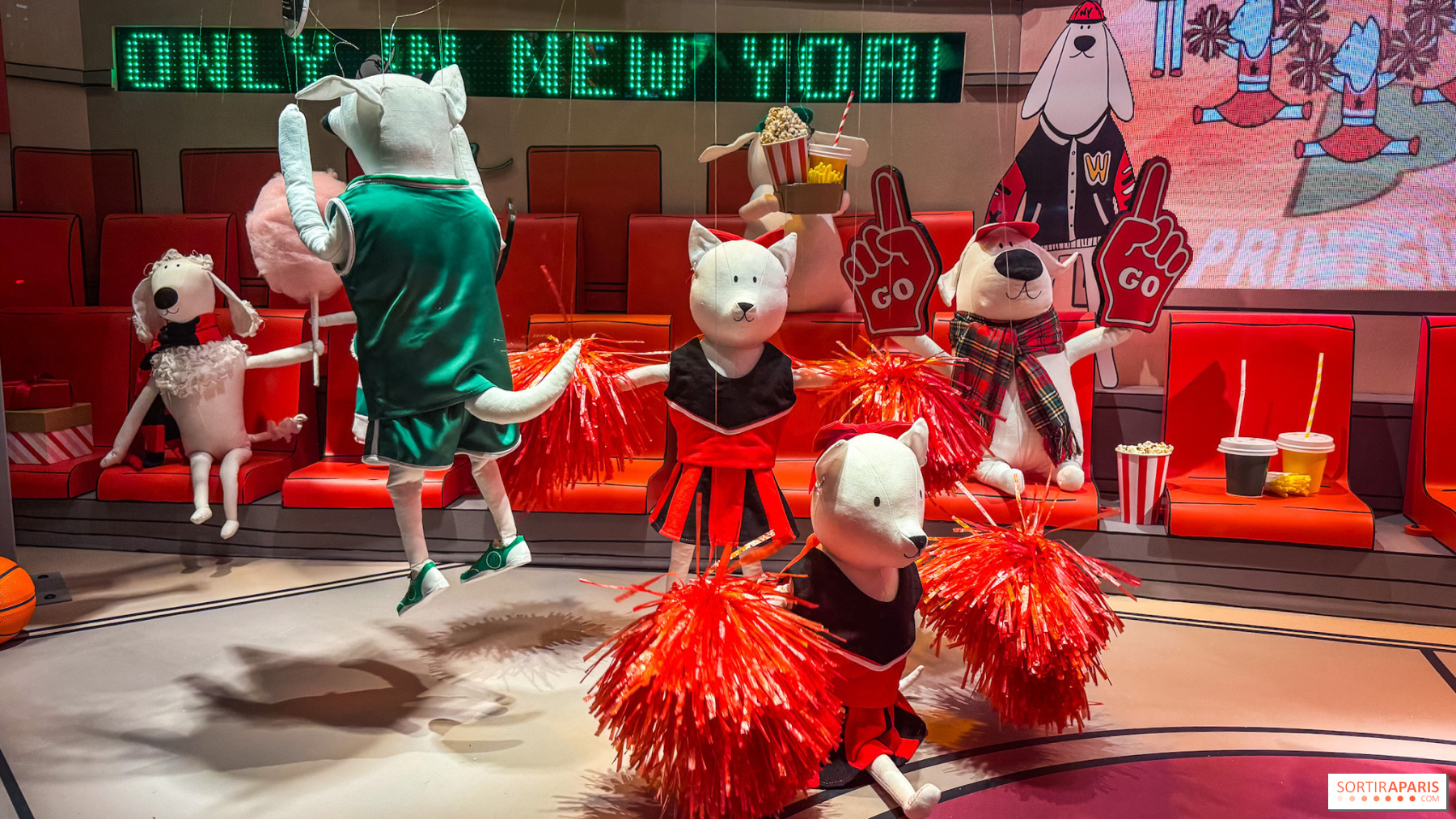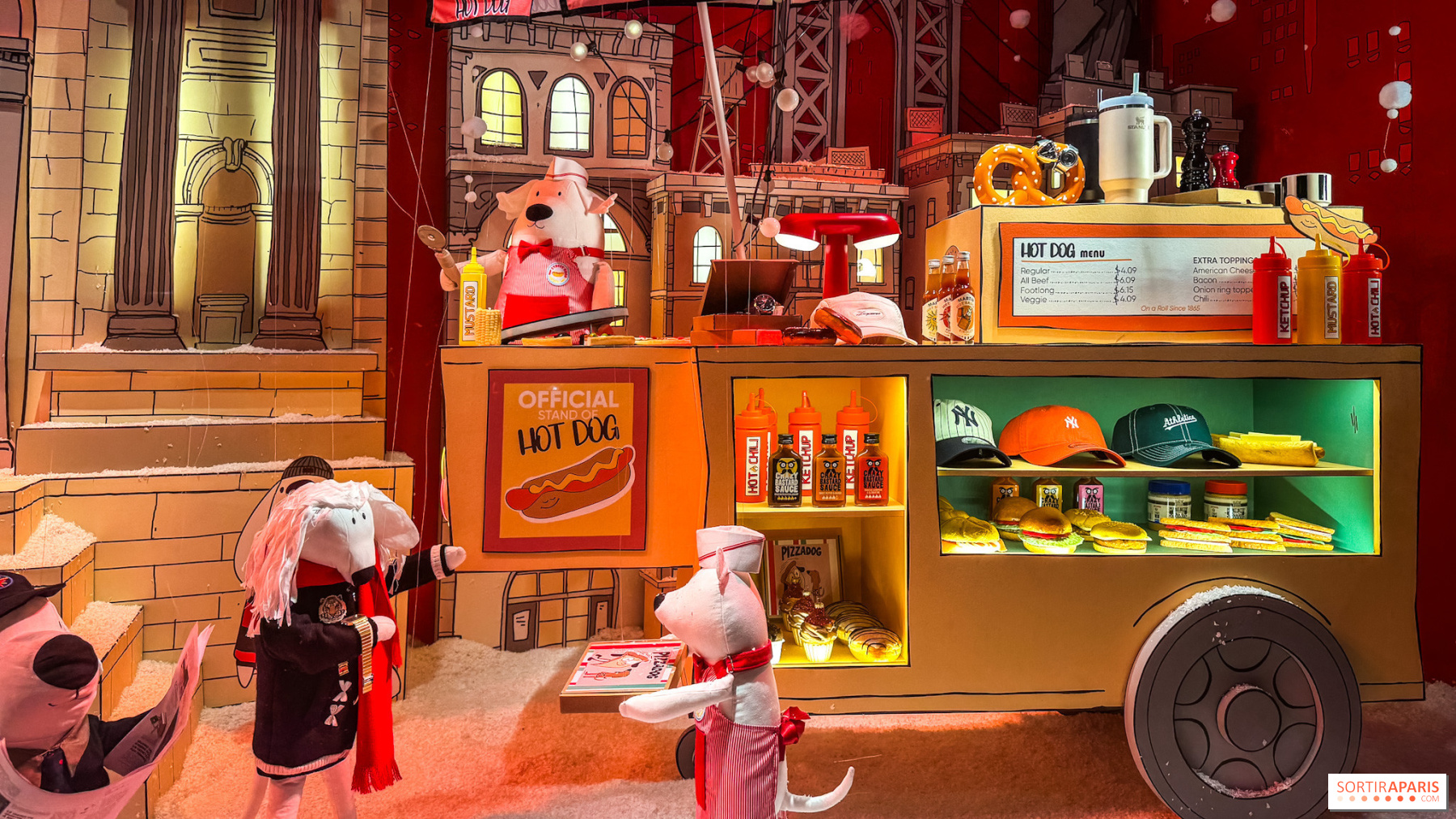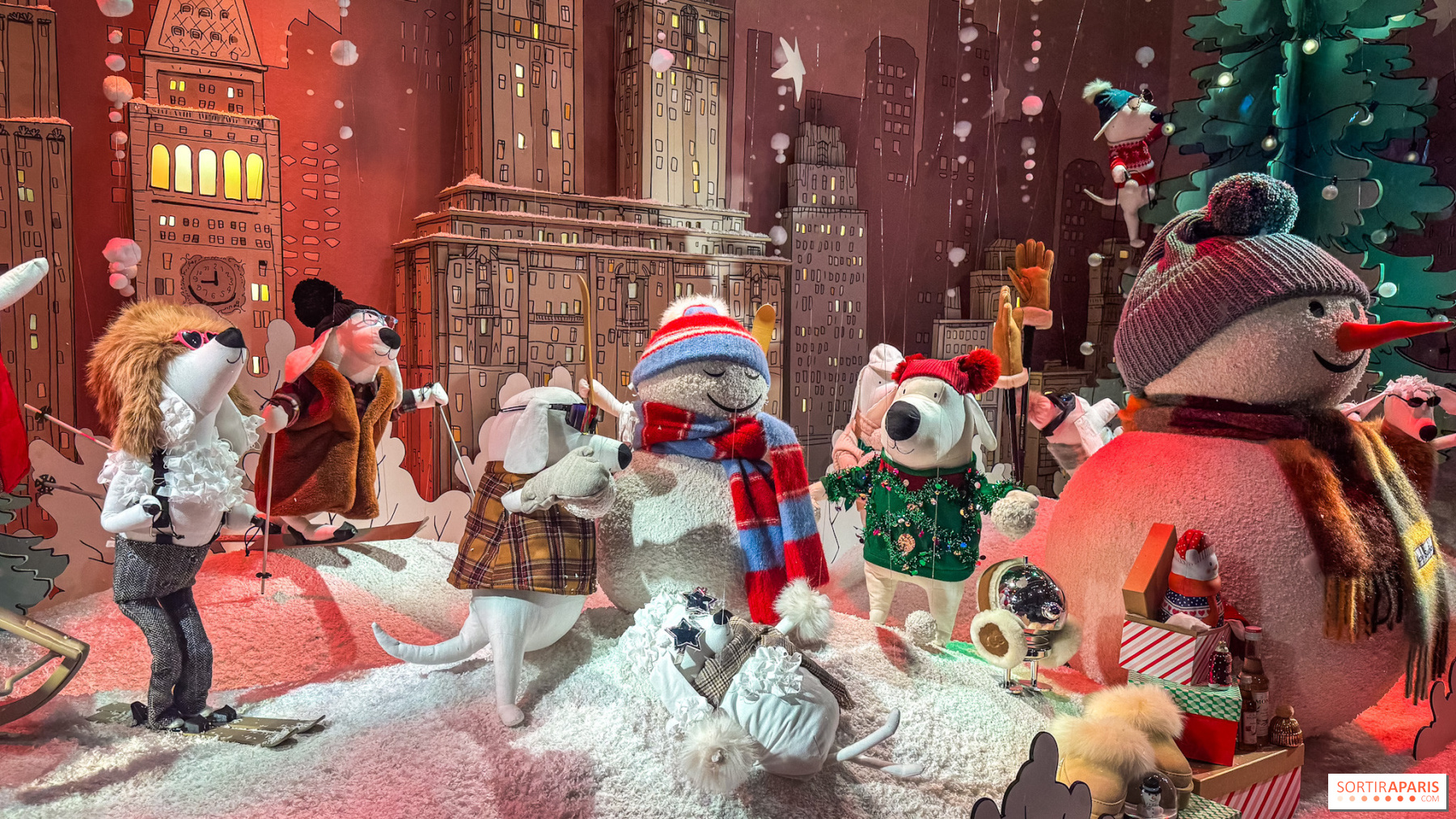 Катання на ковзанах, в'язаний різдвяний светр, міні-сумка для покупок, великий шарф або міні-хот-дог у руці — кожен аксесуар нагадує про сцену з життя Нью-Йорка. Поєднуючи в собі малюнок та емоції, ці виразні собаки розповідають історію дружби, досліджень та святкування. Вони уособлюють місто на рівні морди, повне сюрпризів і магії, між місцевими традиціями та відсиланням до майстерності Printemps. З метою забезпечення стійкості, персонажі, як і декорації, виготовлені з натуральних та переробних матеріалів, таких як картон і тканина.