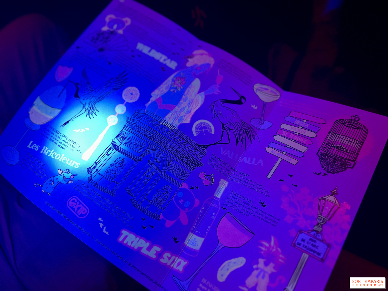 Hiện tại, không có món ăn nhẹ nào được phục vụ, chúng ta sẽ phải đợi đến đầu năm học mới để xem thực đơn đi kèm với 10 loại cocktail đặc trưng, tất cả đều có giá 19 euro. Khi chúng tôi ghé thăm, giá duy nhất này không được ghi trên thực đơn, điều này có thể gây khó chịu cho những khách hàng không có đủ ngân sách. Nhưng thực đơn được minh họa đẹp mắt này cũng ẩn chứa một số bí mật, chỉ có thể được tiết lộ dưới ánh sáng tia cực tím, tiết lộ hai loại cocktail mới!