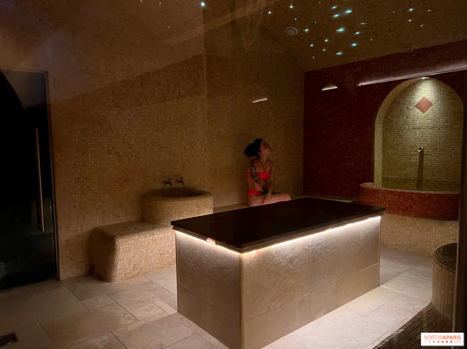 Sau khi qua quầy lễ tân, phòng thay đồ và tẩy trang nếu cần (salon cung cấp tất cả những gì cần thiết để làm mới làn da), đã đến lúc mặc áo choàng tắm mềm mại và khám phá các không gian khác nhau. Ở tầng hầm, chương trình bắt đầu với phòng xông hơi ướt, hay đúng hơn là các phòng xông hơi ướt. O'Kari có hai phòng, một phòng được sưởi ấm ở 37 độ cho những người nhạy cảm với lạnh, phòng kia được sưởi ấm ở 50 độ, với nhiều hơi nước hơn, cho những người thích cảm giác mạnh. Việc đi lại giữa hai phòng là một trải nghiệm rất thú vị.