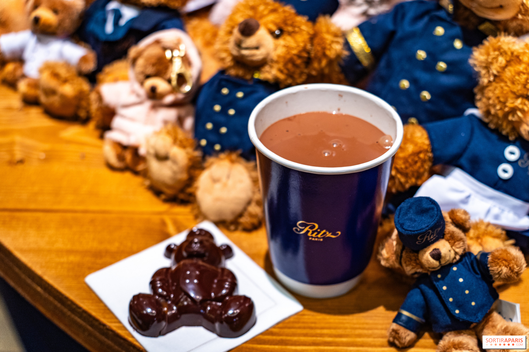 Trong hành lang của khách sạn, thắp sáng quảng trường Vendôme với hàng ngàn ánh đèn, chú gấu khổng lồ này đang chờ bạn đến tham dự sự kiện mùa lễ hội. Bạn có thể dừng chân tại đây để thưởng thức một ly sô cô la nóng đặc trưng của Ritz Paris, được pha chế từ sô cô la Venezuela 70% với độ kem mịn không thể so sánh và hương vị gia vị và hoa cỏ. Tại sao không thử món độc quyền của năm nay:gấu bông marshmallow, sự kết hợp hoàn hảo giữa sô cô la Ecuador 64%, marshmallow mềm mịn và caramel chảy với vani Madagascar. Quý vị đặt hàng trước con gấu khổng lồ rồi vào trong để lấy hàng. Quý vị có thể thưởng thức những món ngọt này trong khi dạo chơi trên quảng trường, trong vườn Tuileries cách đó vài bước chân hoặc mang về trong một hộp màu xanh thanh lịch được trang trí hình con gấu phục vụ.