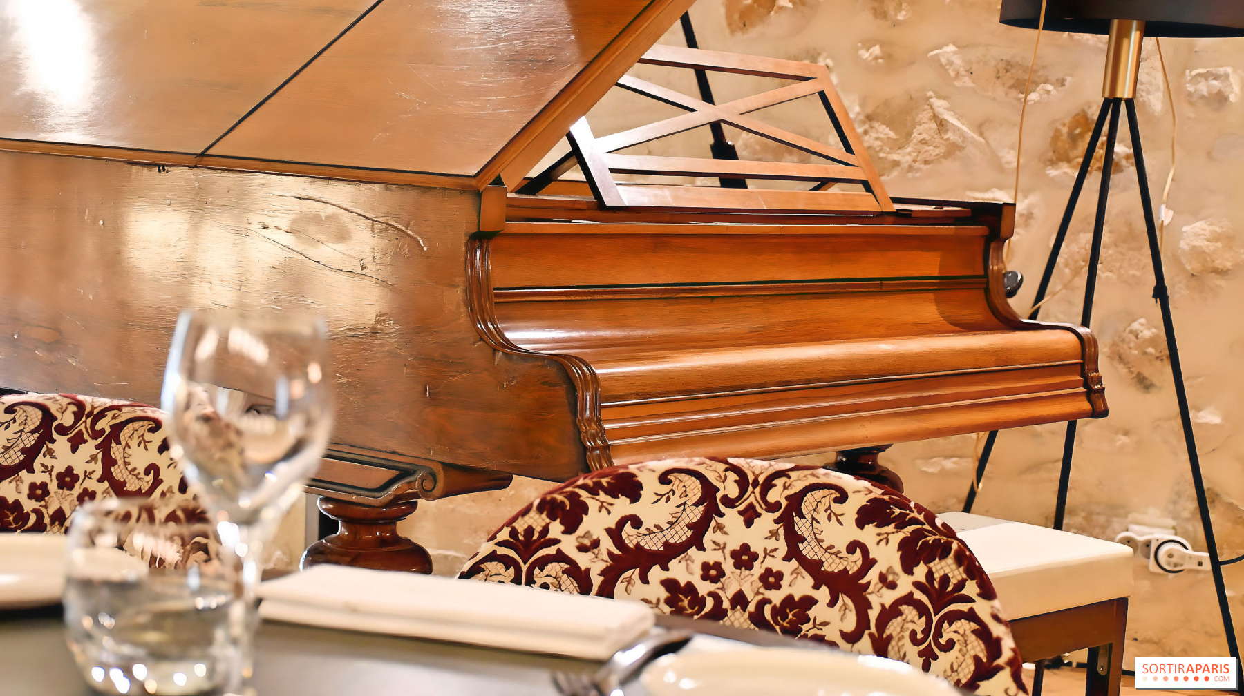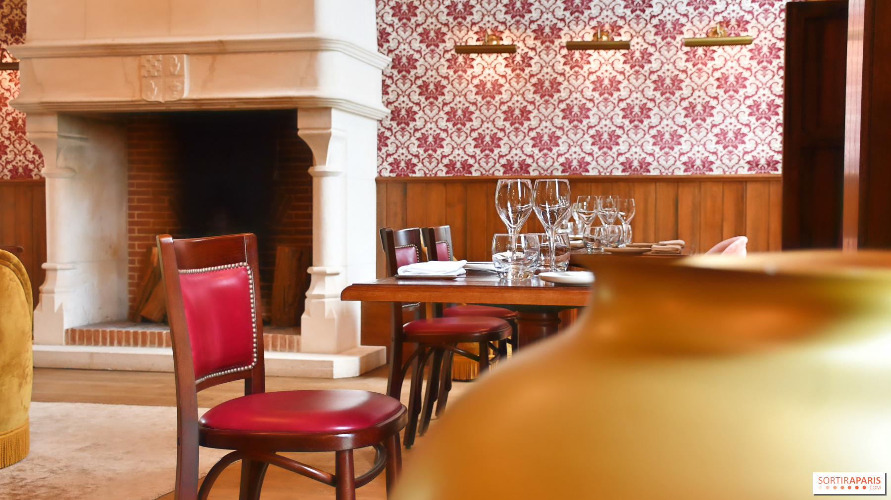 餐厅位于高尔夫球场和葡萄园之间的 Anne de Kiev 公园内,坐落在一栋 经过修复的农舍中,既保留了古老的魅力,又增添了几分现代感和世俗气息:房梁和屋顶结构裸露在外,石雕工艺也是原汁原味的,一楼布置得很舒适,有木制家具、天鹅绒扶手椅、地板地毯、舒适的壁炉(冬天点燃)和一架钢琴。