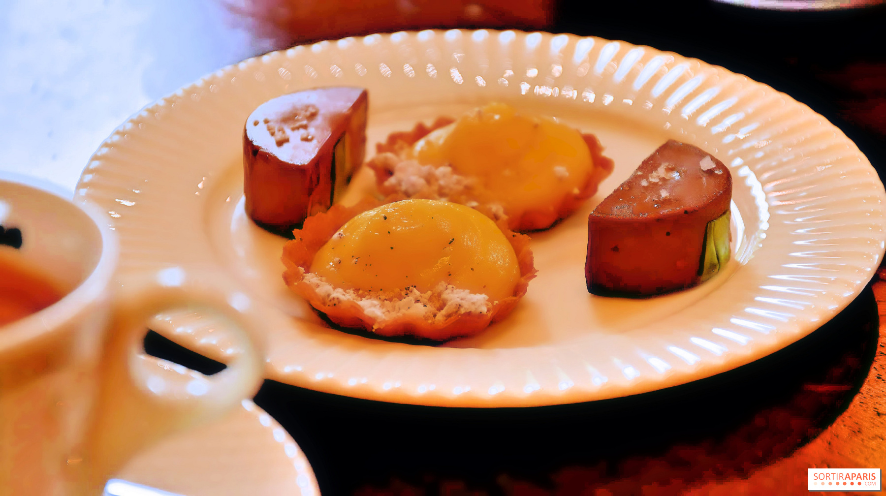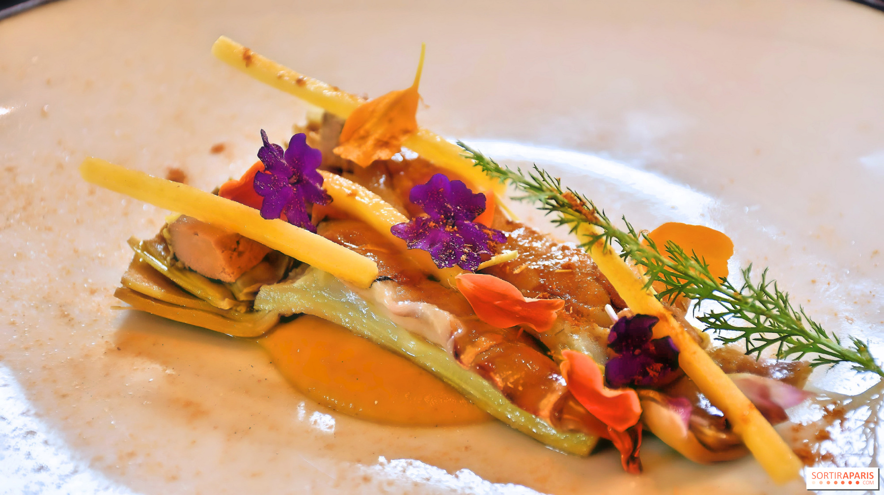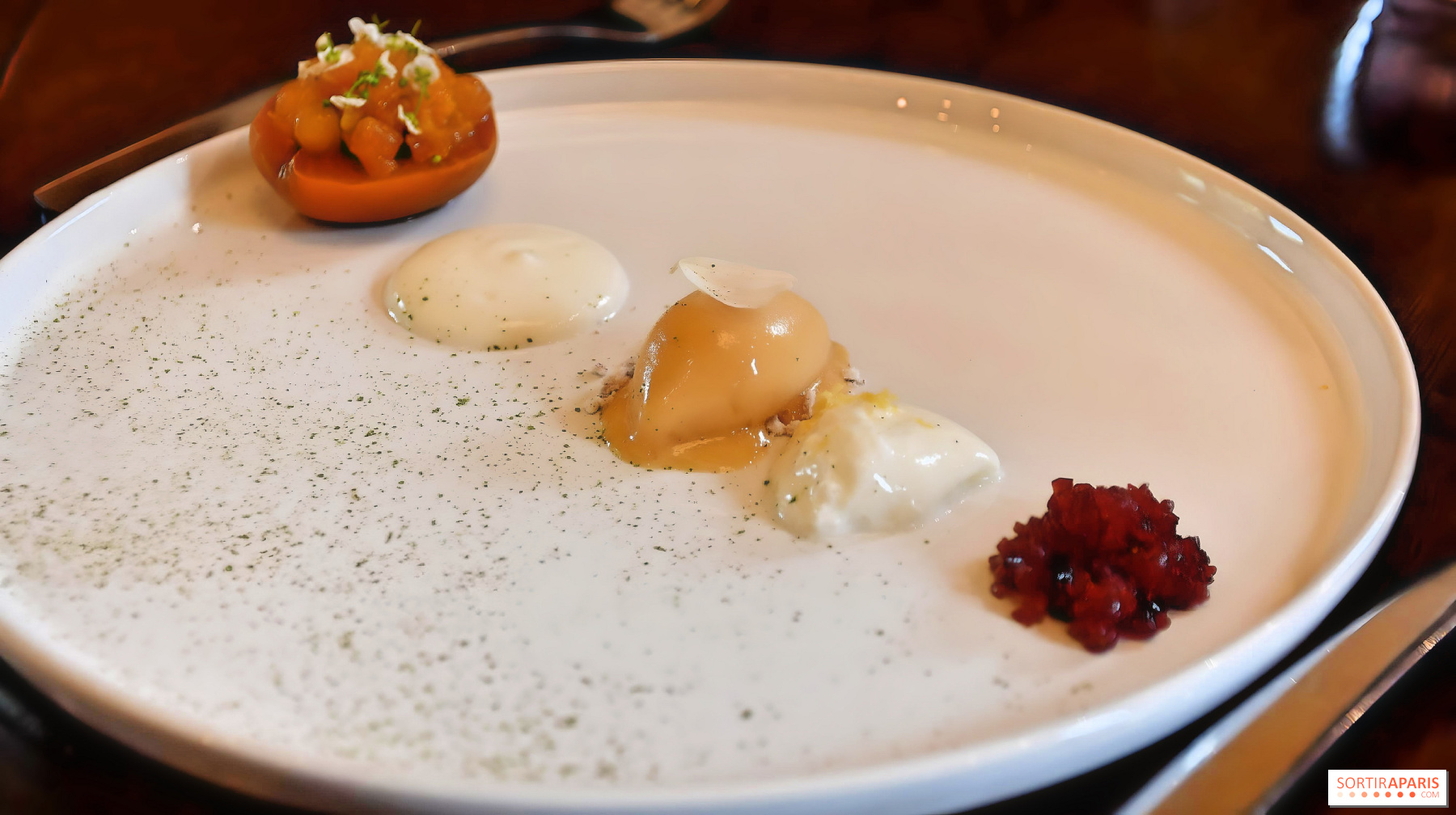 我们的用餐体验以风格独特的开胃菜拉开序幕:以太子妃苹果为灵感的小食配以南瓜调味品,以及以红卷心菜泡菜和令人惊奇的贻贝调味品为配料的蛋挞。作为地方美食的一部分,餐厅供应的面包来自同样位于塞纳-圣德尼省的 Fournil à Montreuil,它以使用天然酸面团而闻名。