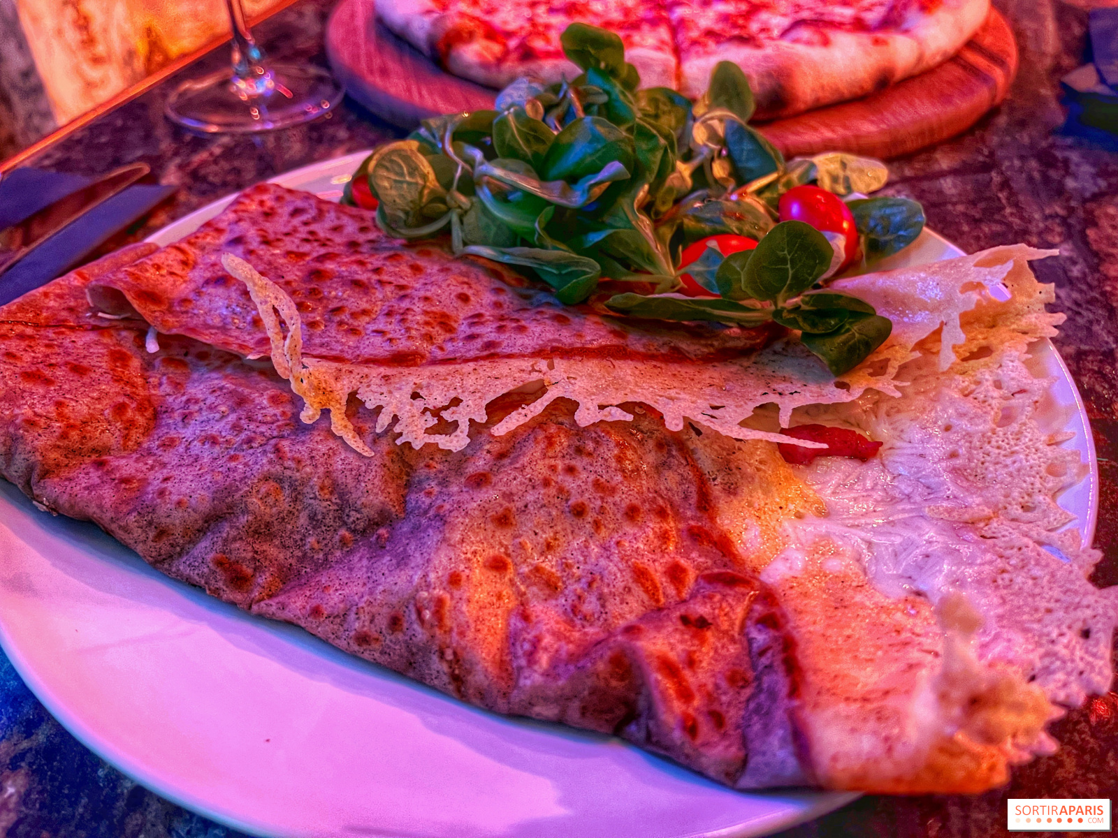 尽管如此,值得注意的是,所有菜肴的份量都非常可观!我们点的烟熏辣椒薯条不是很辣,但很酥脆,分量也很足,还有大块的切达干酪。介绍完这些后,我们又点了一份侯爵夫人披萨(又称玛格丽塔披萨),价格为 9.90 欧元,虽然简单,但味道不错。至于Vicomtesse Fumée(13.5 欧元),这是一种荞麦薄饼,里面有培根、洋葱、奶油和艾门塔尔奶酪,吃起来非常饱满。