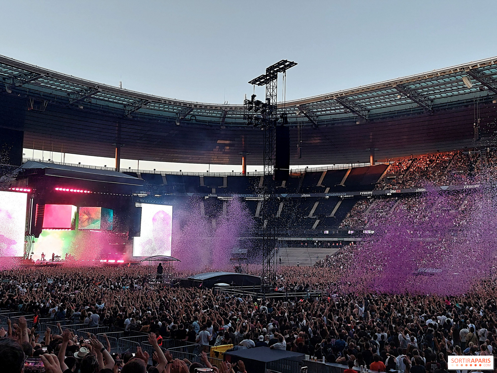 塞纳-圣但尼的夜幕已经降临,灯光照亮了整个体育场,激光在观众席上空飞舞,二氧化碳喷射器和两个立方体悬浮在舞台上方,播放着演唱会的现场画面和视觉效果,使演出呈现出全新的面貌。